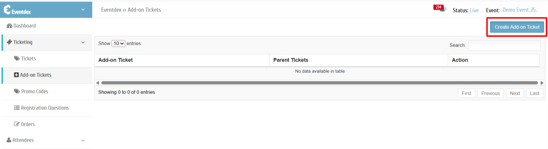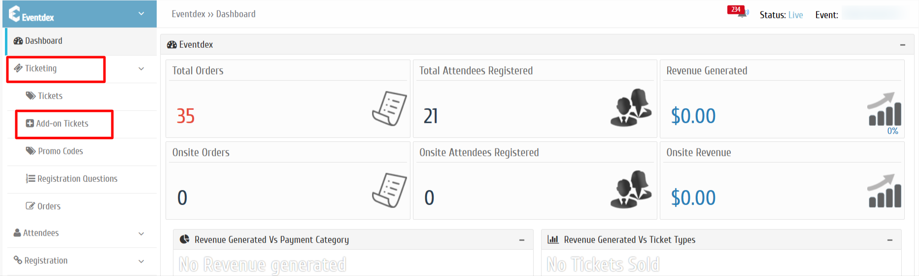 Step 2: Click on the “Ticketing” section and from its accordion menu, click on the “Add-on Tickets” subsection.